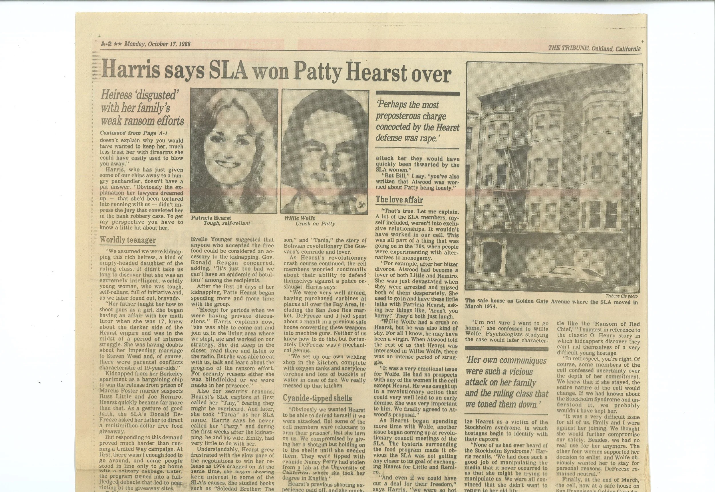 After covering the San Francisco Hearst bank robbery trial in 1975 he went on, thirteen years later, to score an exclusive Oakland Tribune with Bill Harris, the man who actually kidnapped Patty Hearst and wound up fleeing cross country with her and his wife Emily Harris.